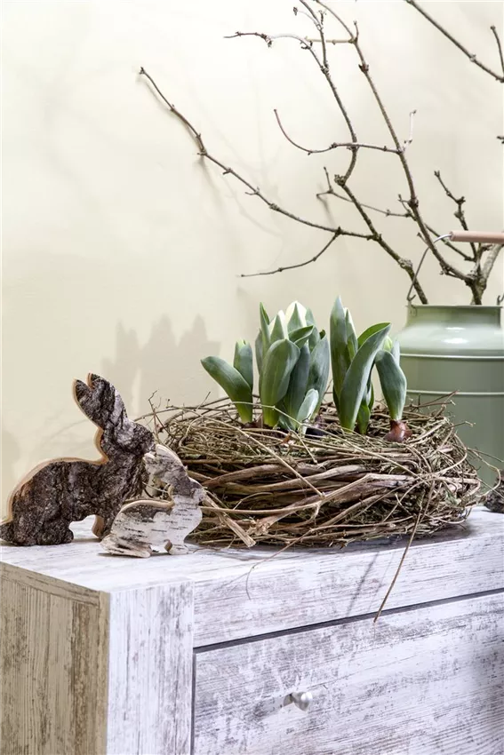 Vögel bereiten ihre Nester für ihren Nachwuchs vor und machen es ihnen besonders bequem. Das passiert jetzt auch mit dem Netz im Osterkranz. Dafür wird das kleine Nest mit Moos ausgekleidet, sodass eine flache Ebene entsteht. Die Eier werden oben so aufgeschlagen, dass die Öffnung groß genug ist, damit die Wurzeln der Pflanzen in die Eierschale passen. Die Eier werden dann ausgespült und bekommen mit Draht und Heißkleber ein Füßchen, mit dem die Eier ganz leicht in das Moos gesteckt werden können. Und dann können die Pflänzchen einziehen.