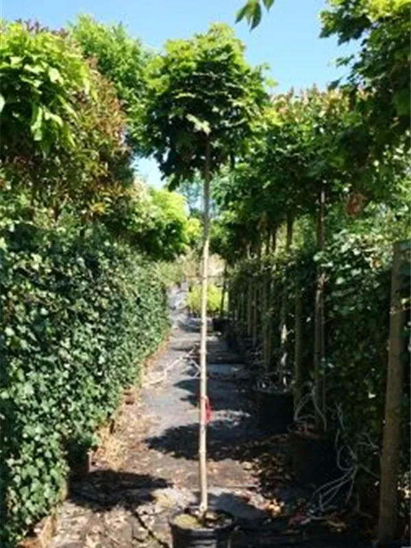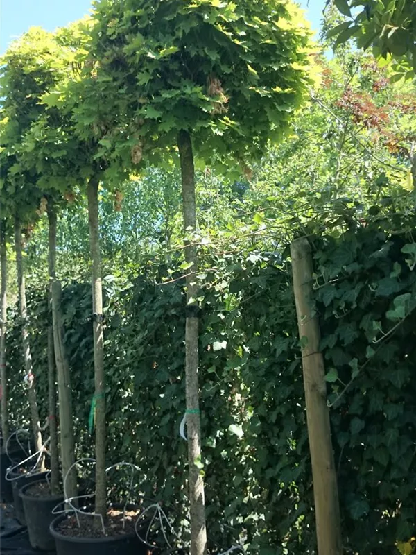 An einem sonnigen bis halbschattigen Standort mit durchlässiger und lockerer Erde sind für den Kugelahorn 'Globosum' mit seinem kugelförmigen Wuchs Größen von 6 m und Breiten von 6 m durchaus möglich.