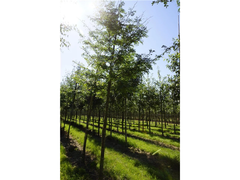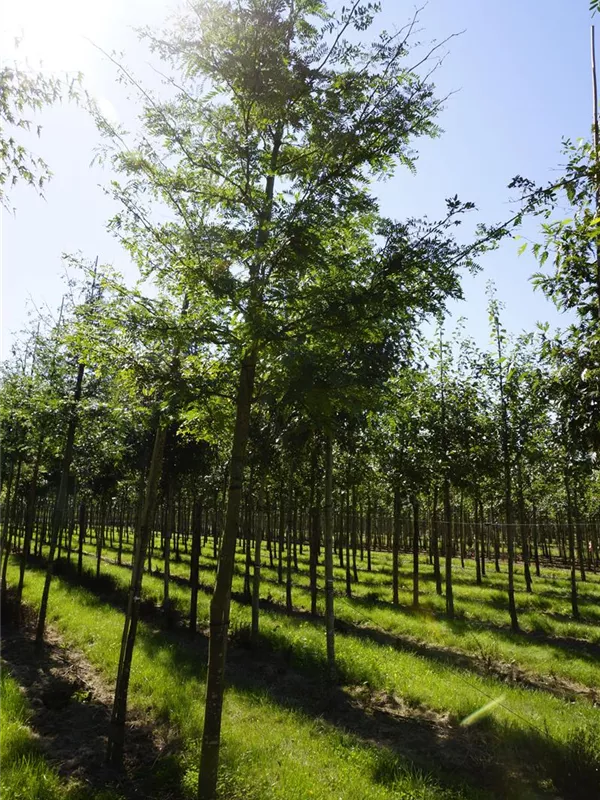 An einem sonnigen Standort mit guter Erde sind für den Dornenlosen Lederhülsenbaum 'Inermis' mit seinem schirmförmigen und malerischen Wuchs Größen von 25 m und Breiten von 20 m durchaus möglich.