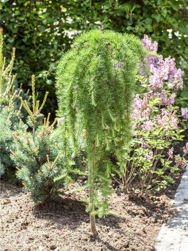 An einem sonnigen Standort mit durchlässiger und nährstoffreicher Erde sind für die Hänge-Lärche 'Stiff Weeper' mit ihrem überhängenden Wuchs Größen von 3 m und Breiten von 1,5 m durchaus möglich.