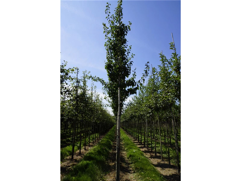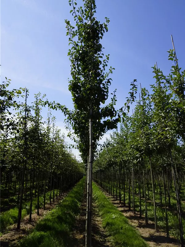 An einem sonnigen bis halbschattigen Standort mit lockerer und lehmiger Erde sind für die Wildbirne 'Beach Hill' mit ihrem pyramidalen und schlanken Wuchs Größen von 15 m und Breiten von 7 m durchaus möglich.