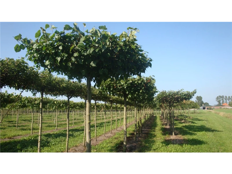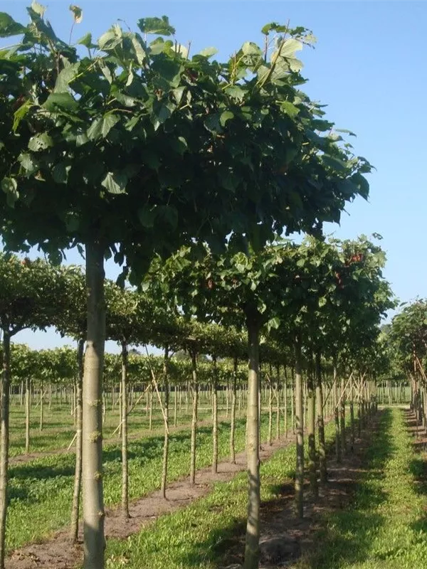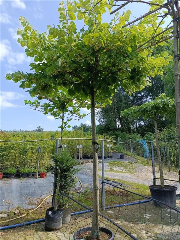 An einem sonnigen Standort mit durchlässiger und nährstoffreicher Erde sind für die Kaiser-Linde 'Pallida' mit ihrem kegelförmigen Wuchs Größen von 40 m und Breiten von 20 m durchaus möglich.
