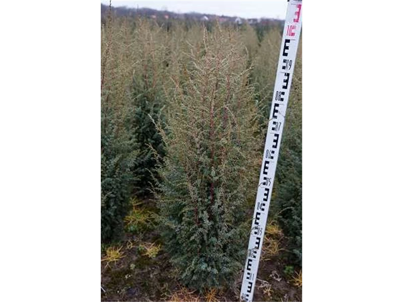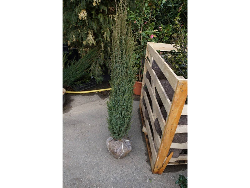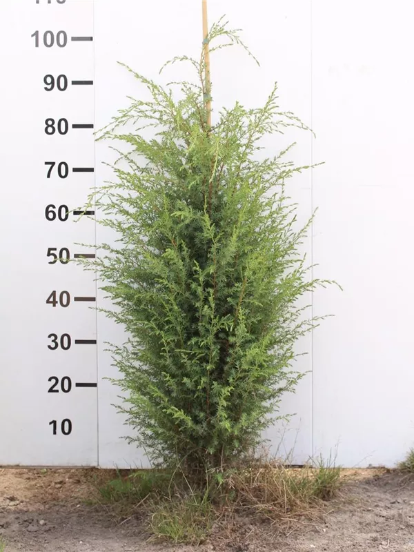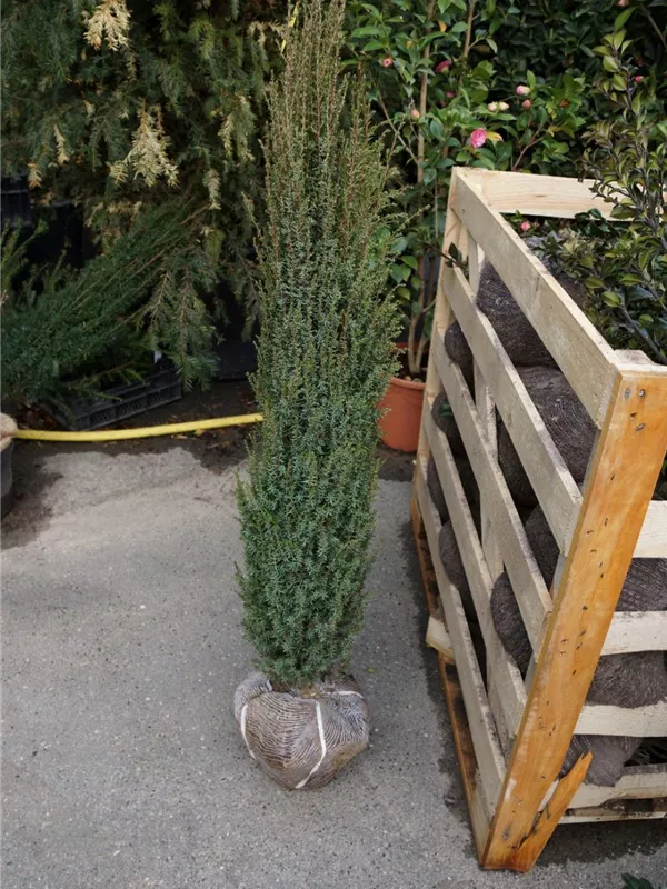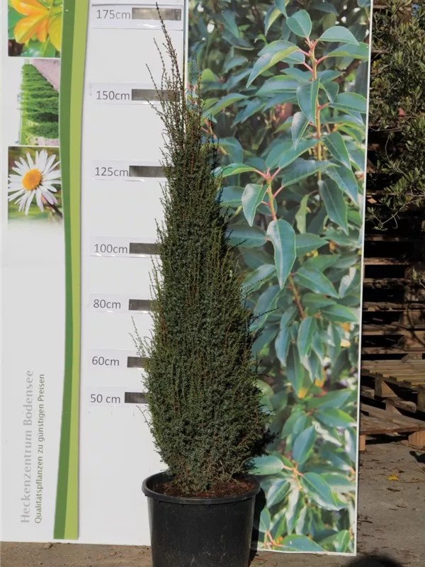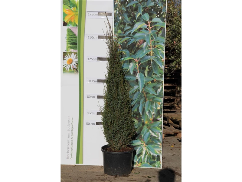 An einem sonnigen Standort mit durchlässiger Erde sind für den Irischen Säulenwacholder 'Hibernica' mit seinem säulenförmigen und dichten Wuchs Größen von 5 m und Breiten von 1,2 m durchaus möglich.