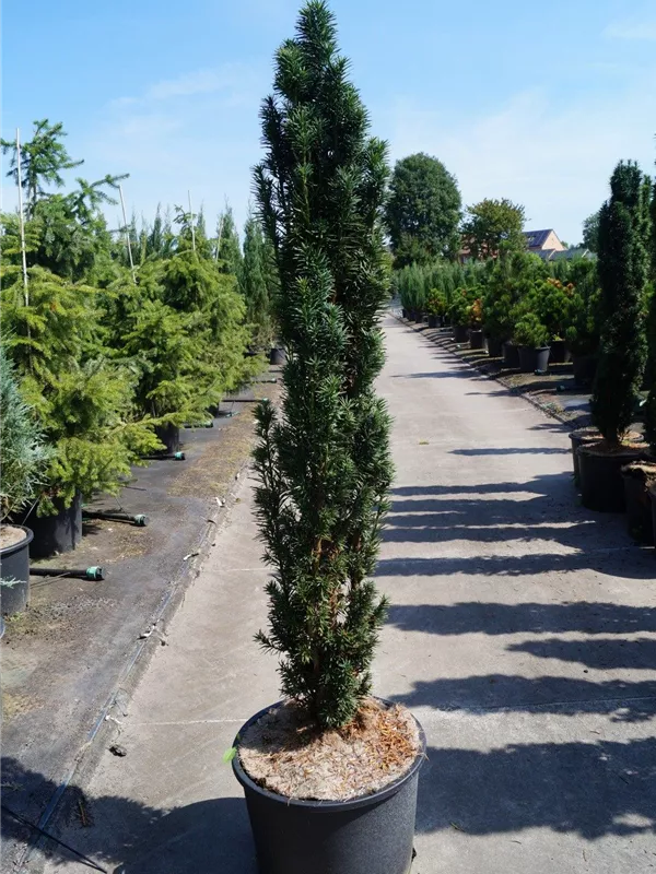 An einem sonnigen bis halbschattigen Standort mit durchlässiger, kalkhaltiger und nährstoffreicher Erde sind für die Schmalen Säuleneibe 'Fastigiata Robusta' mit ihrem säulenförmigen und straffen Wuchs Größen von 8 m und Breiten von 2,5 m durchaus möglich.