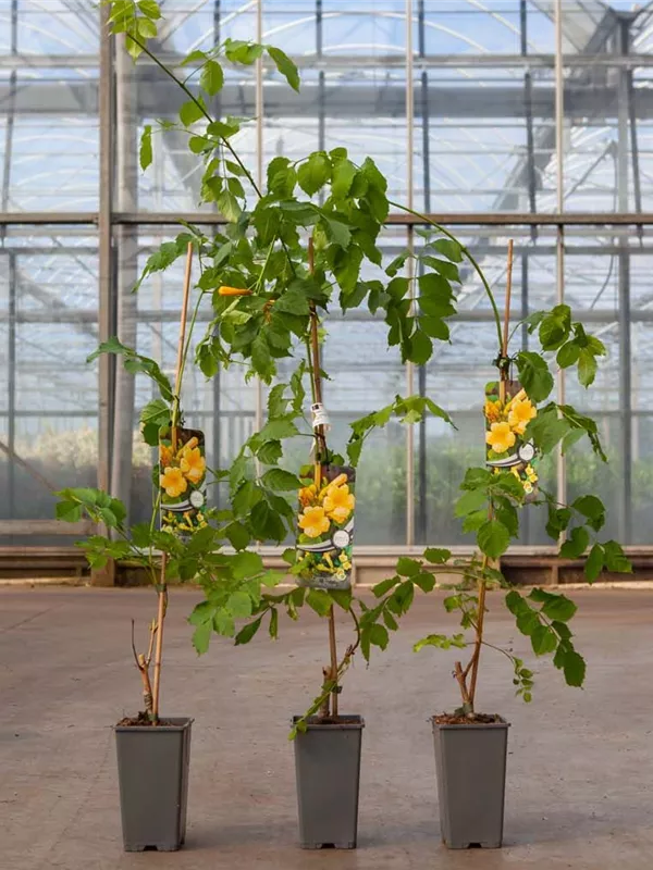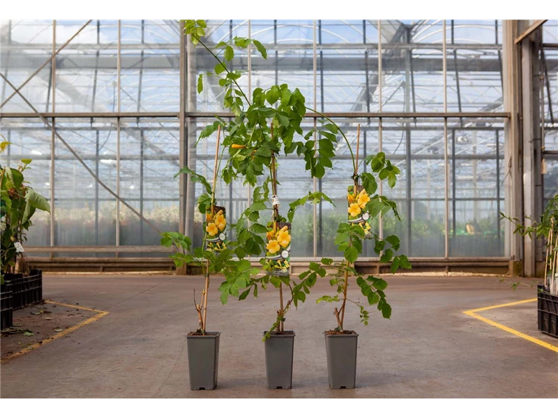An einem sonnigen bis halbschattigen Standort mit durchlässiger und nährstoffreicher Erde sind für die Gelben Trompetenblume 'Flava' mit ihrem kletternden Wuchs Höhen von 3,5 m und Breiten von 2,5 m durchaus möglich.