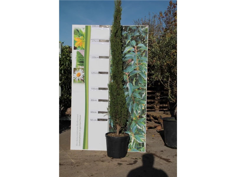 An einem sonnigen Standort mit durchlässiger Erde sind für die Echten Säulenzypresse 'Pyramidalis' mit ihrem säulenförmigen Wuchs Höhen von 10 m und Breiten von 5 m durchaus möglich.