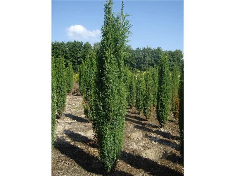 An einem sonnigen Standort mit durchlässiger Erde sind für den Irischen Säulenwacholder 'Hibernica' mit seinem säulenförmigen und dichten Wuchs Größen von 5 m und Breiten von 1,2 m durchaus möglich.