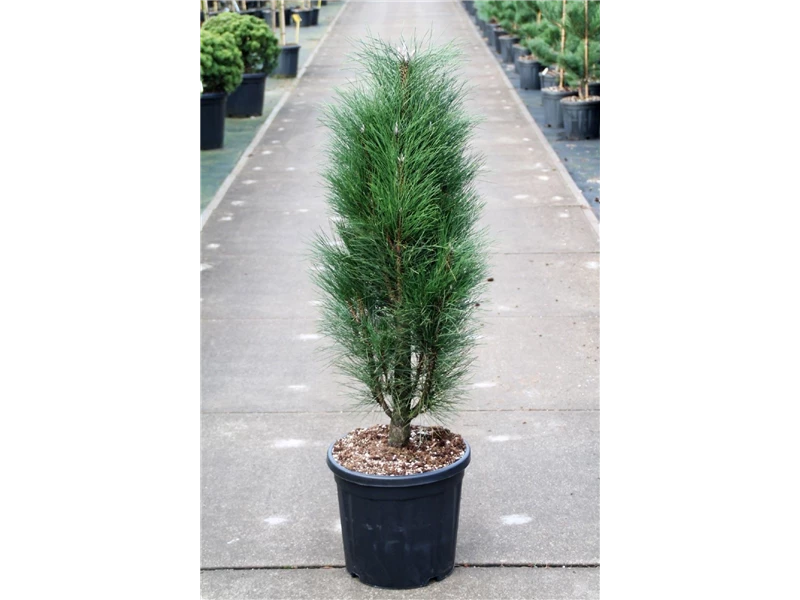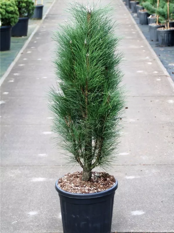 An einem sonnigen Standort mit durchlässiger, kalkhaltiger und sandiger Erde sind für die Schwarzkiefer 'Green Tower' mit ihrem dichten, kompakten und säulenförmigen Wuchs Größen von 2 m und Breiten von 50 cm durchaus möglich.