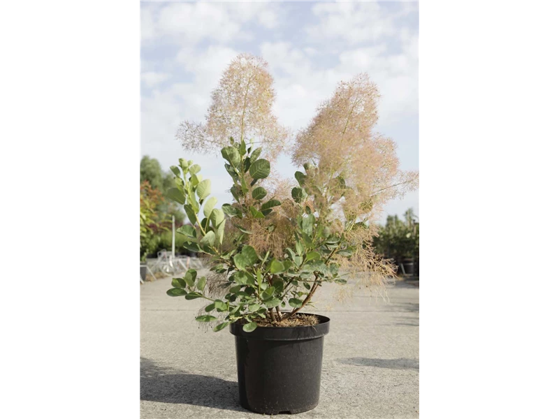 An einem sonnigen Standort mit guter Erde sind für den Perückenstrauch 'Young Lady'(s) mit seinem kompakten Wuchs Größen von 3 m und Breiten von 3 m durchaus möglich.