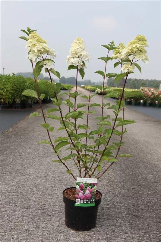 Beschreibung Ein sommergrünes Laubgehölz, dass seinen Platz im Garten haben möchte und unter anderem als beeindruckender Solitär zu begeistern weiß - dafür steht die Rispenhortensie 'Fraise Melba'®. Charakteristisch sind ihre mittelgrünen Blätter mit ihrer spitze Ei-Form. Nicht außer Acht zu lassen sind auch die purpurrot-weißen Blüten von Juni bis Oktober, die einen angenehmen Duft verbreiten.