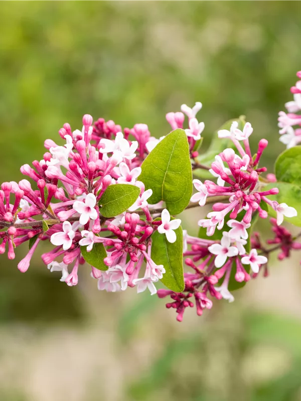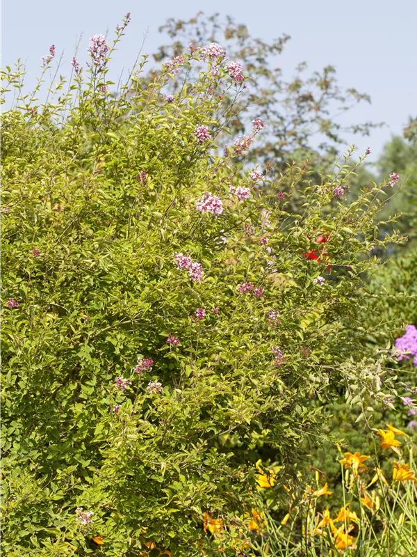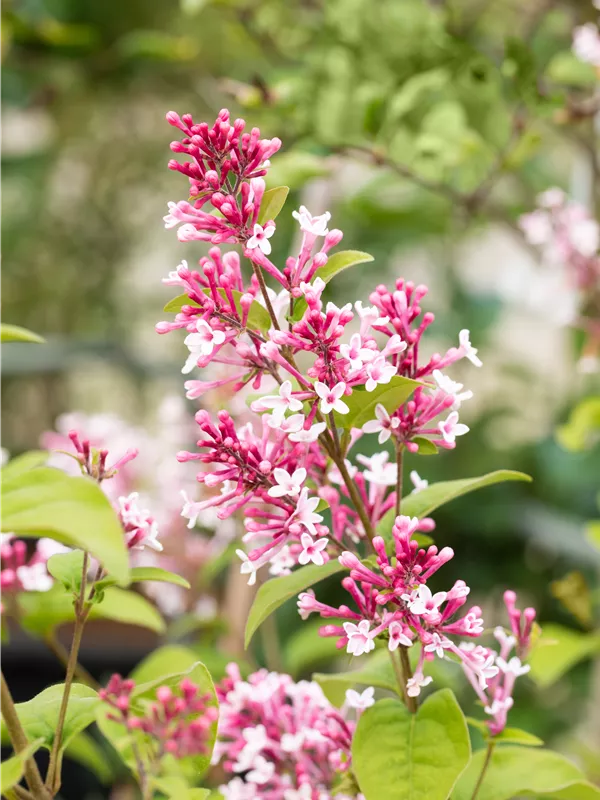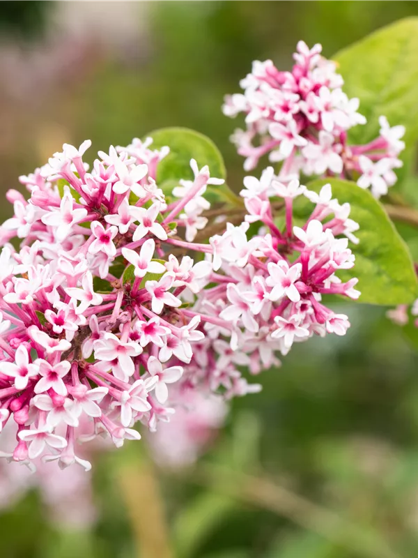 In Rispen angeordnete und stark duftende Blüten erscheinen von Mai bis Juni in rosa.