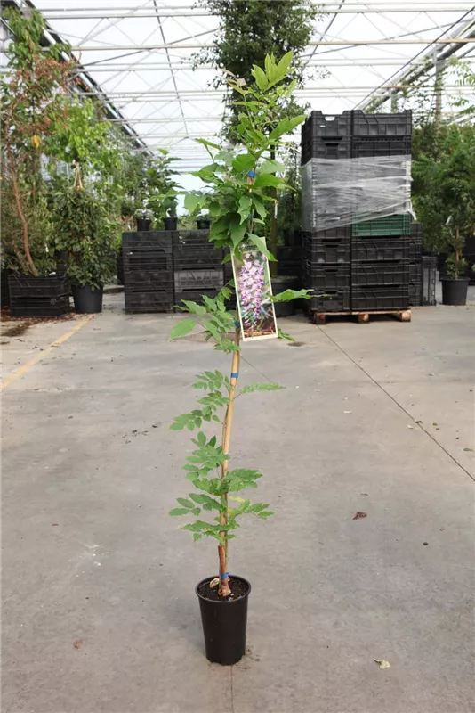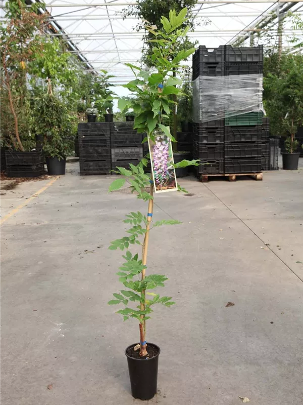 An einem sonnigen bis halbschattigen Standort mit durchlässiger, sandiger, saurer, lehmiger und schwachsaurer Erde sind für den Blauregen 'Issai Perfect' mit seinem rankenden und verzweigten Wuchs Größen von 8 m und Breiten von 6 m durchaus möglich.