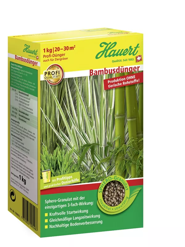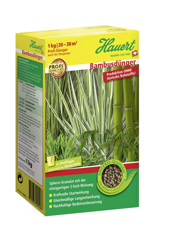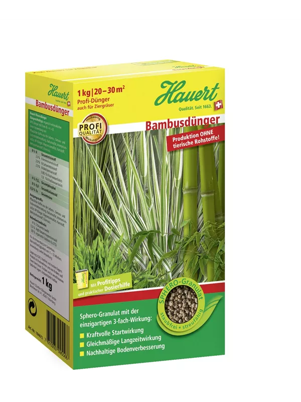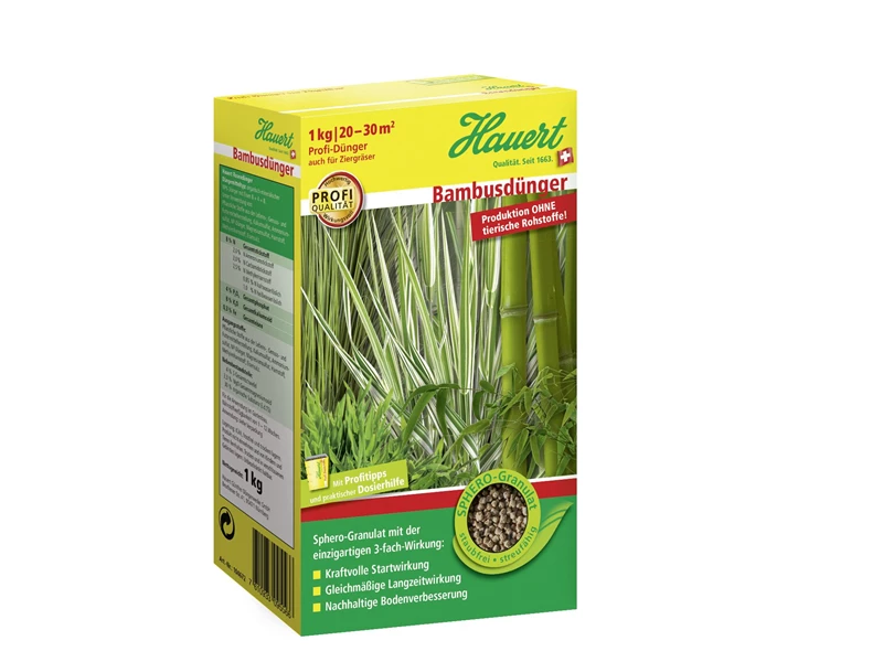 Weitere Informationen Hauert Bambusdünger mit 3-fach-Wirkung für kräftiges Grün. Startwirkung, Langzeitwirkung und Boden­verbesserung. Granuliert, gut streufähig. Organisch-mineralisch, mit kulturbezogenem Nährstoff­verhältnis. Für alle Bambus- und Ziergrasarten. Aufwandmenge: Neupflanzung: Bambus 30?–?40 g/m2 Ziergräser 20??–?30 g/m2 Bestehende Pflanzen: Bambus 40?–?50 g/m2 Ziergräser 30?–?40 g/m2 Düngemitteltyp: Organisch-mineralischer NPK-Dünger mit Magnesium, Schwefel und Eisen 18+4+6?(+3,3+7)+Fe Körnung: Sphero-Granulat 2,5 mm Produktion ohne tierische Rohstoffe!
