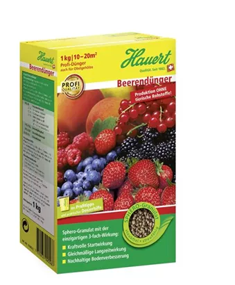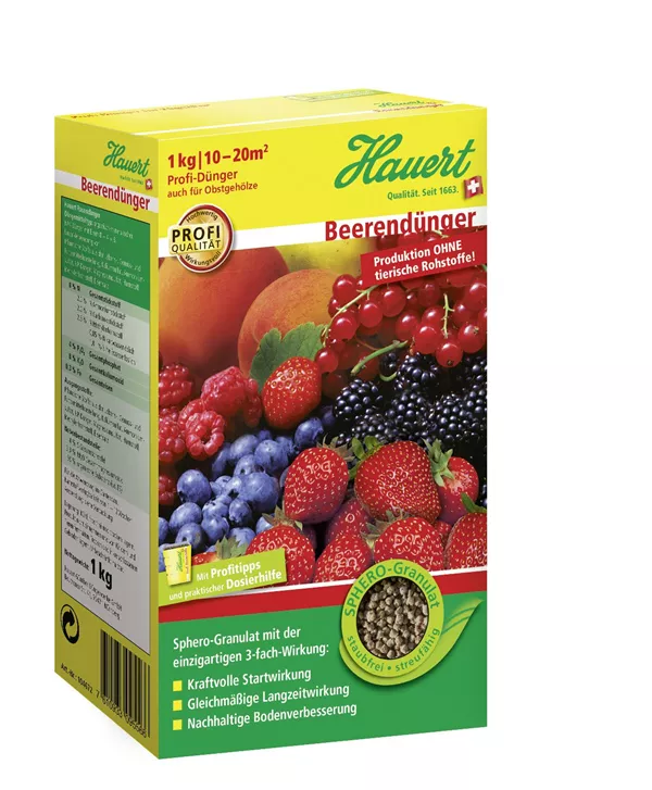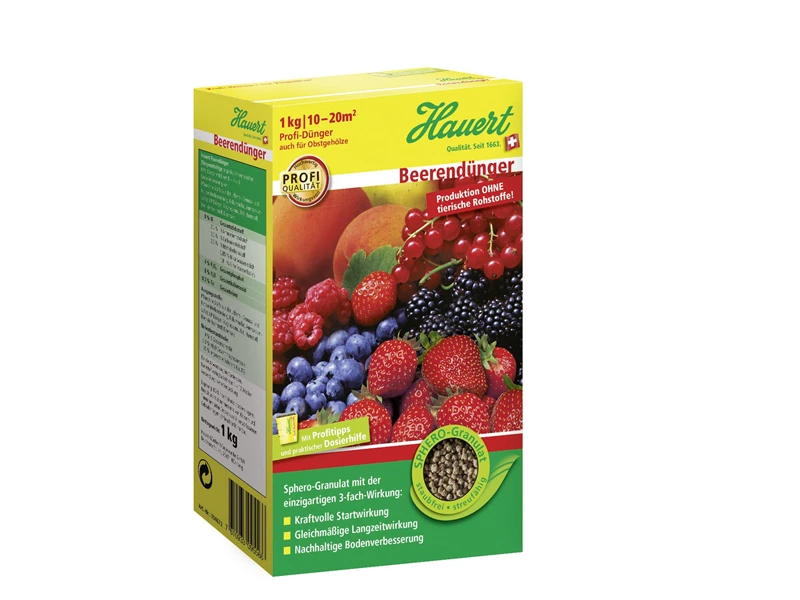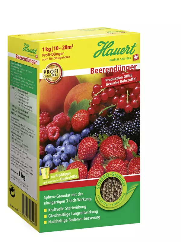 Weitere Informationen Hauert Beerendünger mit 3-fach-Wirkung für gesunde Früchte. Startwirkung, Langzeitwirkung und Boden­verbesserung. Granuliert, gut streufähig. Organisch-mineralisch, mit kulturbezogenem Nährstoff-verhältnis. Für Erdbeeren und andere Beerenobstarten wie z.B. Himbeeren, Brombeeren, Stachel- und Johannisbeeren. Aufwandmenge: 80?–100 g/m2 nach der Ernte 20?–?40 g/m2 im zeitigen Frühjahr Düngemitteltyp: Organisch-mineralischer NPK-Dünger mit Magnesium 9+3+10?(+3) Körnung: Sphero-Granulat 2,5 mm Produktion ohne tierische Rohstoffe!